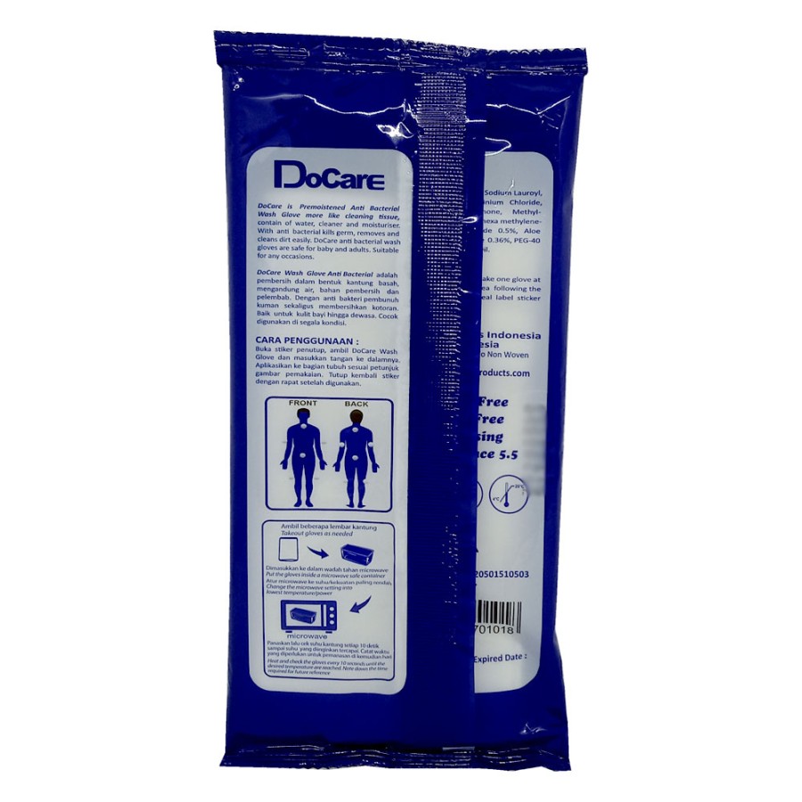 DoCare Wash Glove Adalah washlap sekali pakai (disposable), terbuat dari bahan non woven mengandung Air, sabun tanpa bilas, Antiseptik, pelembut dan pelembab.