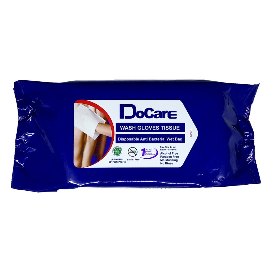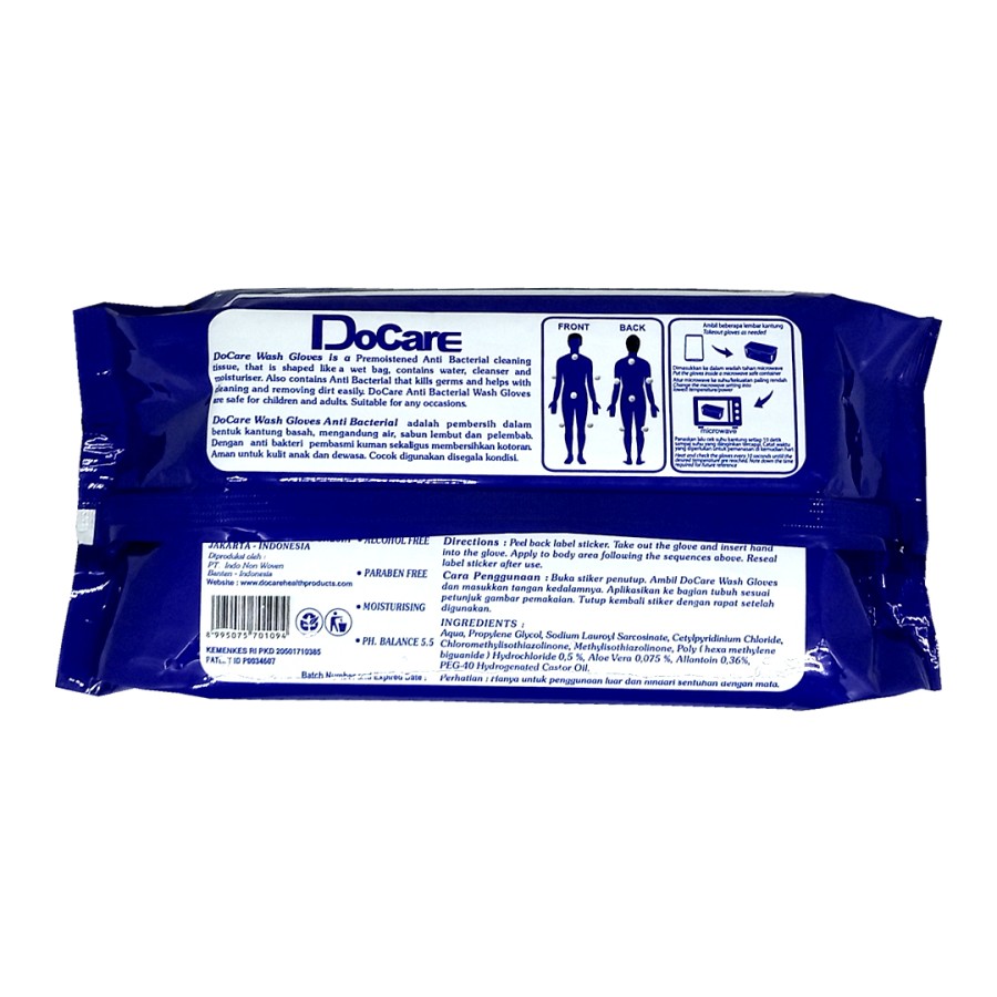 DoCare Wash Glove Adalah washlap sekali pakai (disposable), terbuat dari bahan non woven mengandung Air, sabun tanpa bilas, Antiseptik, pelembut dan pelembab.